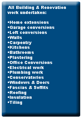 We work exclusively for you .... Welcome to our website. Please have a look at our previous work, displayed in our portfolio page. Here you will find not only examples of our building work, but also of our kitchen and bathroom contracts. We complete all work to the highest standards, concentrating on one contract at a time to ensure that you receive an excellent standard to customer service. |